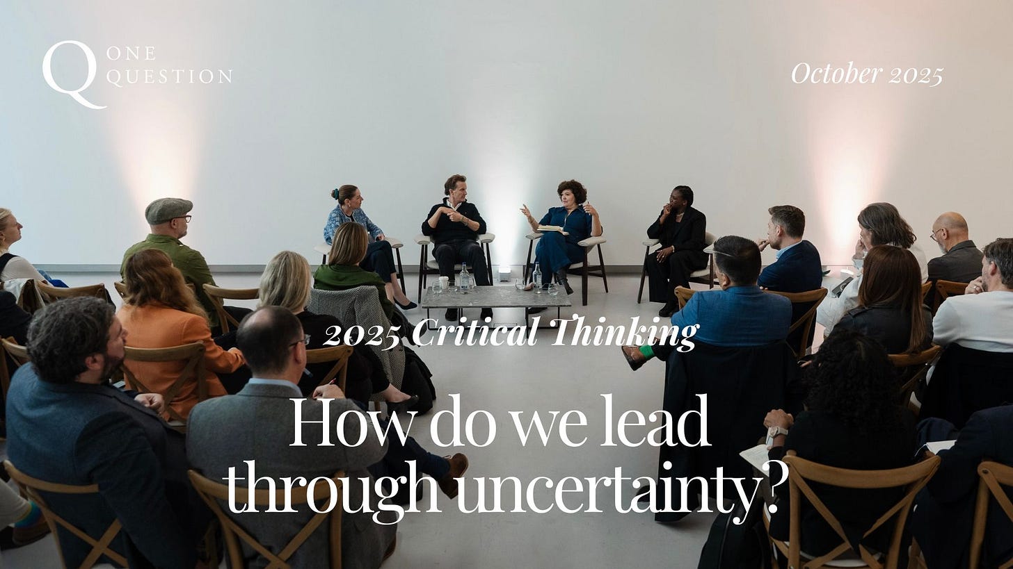Over the course of the next few months I am taking this thinking into organisations as a 90-minute briefing, exploring the challenges your leadership teams are facing. If you are keen to find out more, or would like to become part of the One Question community, drop me a note.